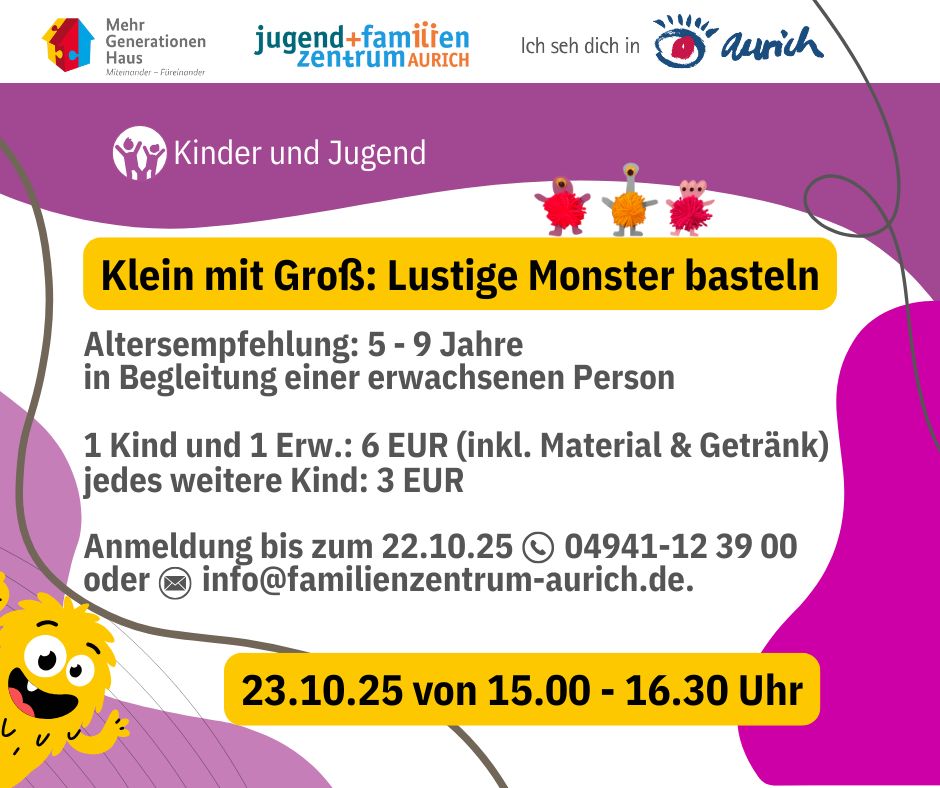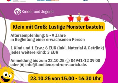 Anmeldung erforderlich bis 22.10.25 unter Telefon 04941-12 39 00 oder per Mail: info@familienzentrum-aurich.de.
