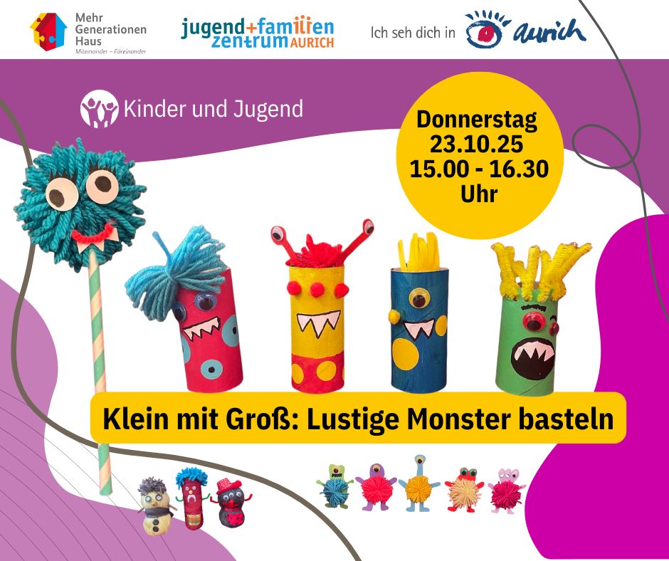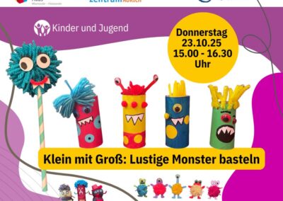 Nach dem Motto „Herbstzeit ist Gruselzeit“ wollen wir gemeinsam Monster aus verschiedenen Materialien basteln. Aber keine Angst: Unsere Monster sind eher lustig als gruselig!